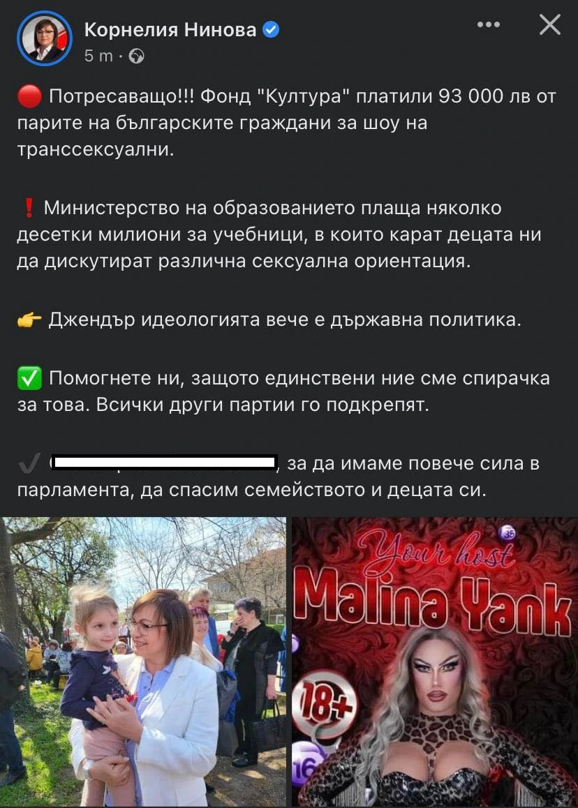 „Потресаващо!!! Фонд "Култура" платили 93 000 лв от парите на българските граждани за шоу на транссексуални. Министерство на образованието плаща няколко десетки милиони за учебници, в които карат децата ни да дискутират различна сексуална ориентация“, написа във Фейсбук Нинова.