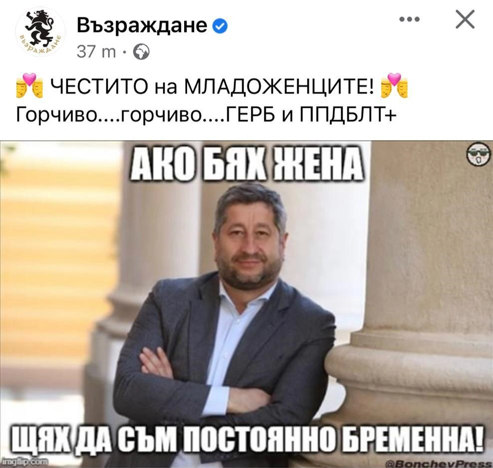 Що се отнася до избирателите на ГЕРБ и ППДГБТ+, искам да ги поздравя с неувяхващото парче на Преслава "Новата ти", по-известно с името "Да ти честитя ли" И за да не стане объркване да поясня - "Новата ти" е за избирателите на ГЕРБ, а "Да ти честитя ли" е за избирателите на ППДГБТ+ Честито на младоженеца и булката:)