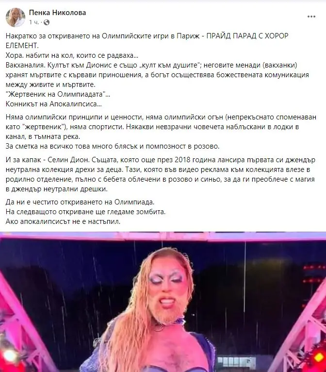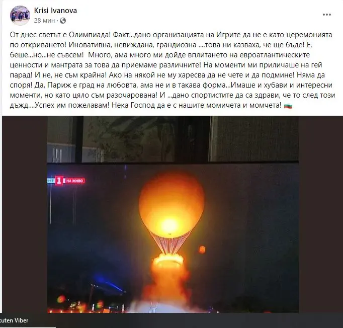 Зрелищната, впечатляваща и напоена с дъжд церемония по откриването на Игрите в Париж. Невиждана досега армада от 7000 атлети мина по река Сена. Светлинно шоу, огромен балон, танци и музика съпроводиха церемонията по мостовете и брега на реката. В социалната мрежа Фейсбук у нас обаче се появиха редица коментари на прекалената разкрепостеност на част от церемонията.