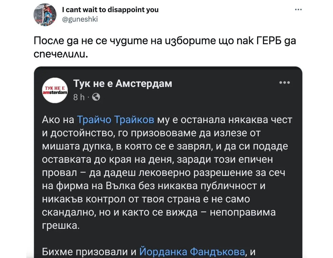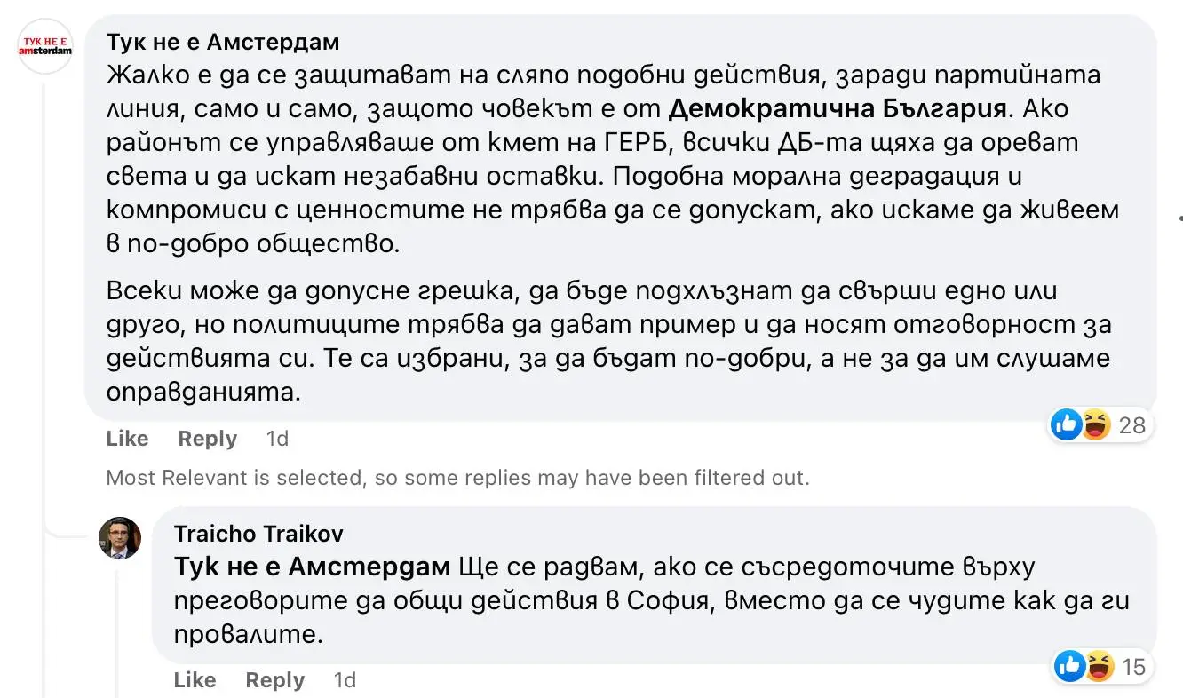 На онлайн битка между Борис Бонев и Трайчо Трайков стават свидетели потребителите на социалните мрежи. Неофициалната група на общинския съветник Бонев „Тук не е Амстердам” призова кмета от ДБ Трайчо Трайков да излезе от мишата си дупка и да подаде оставка.