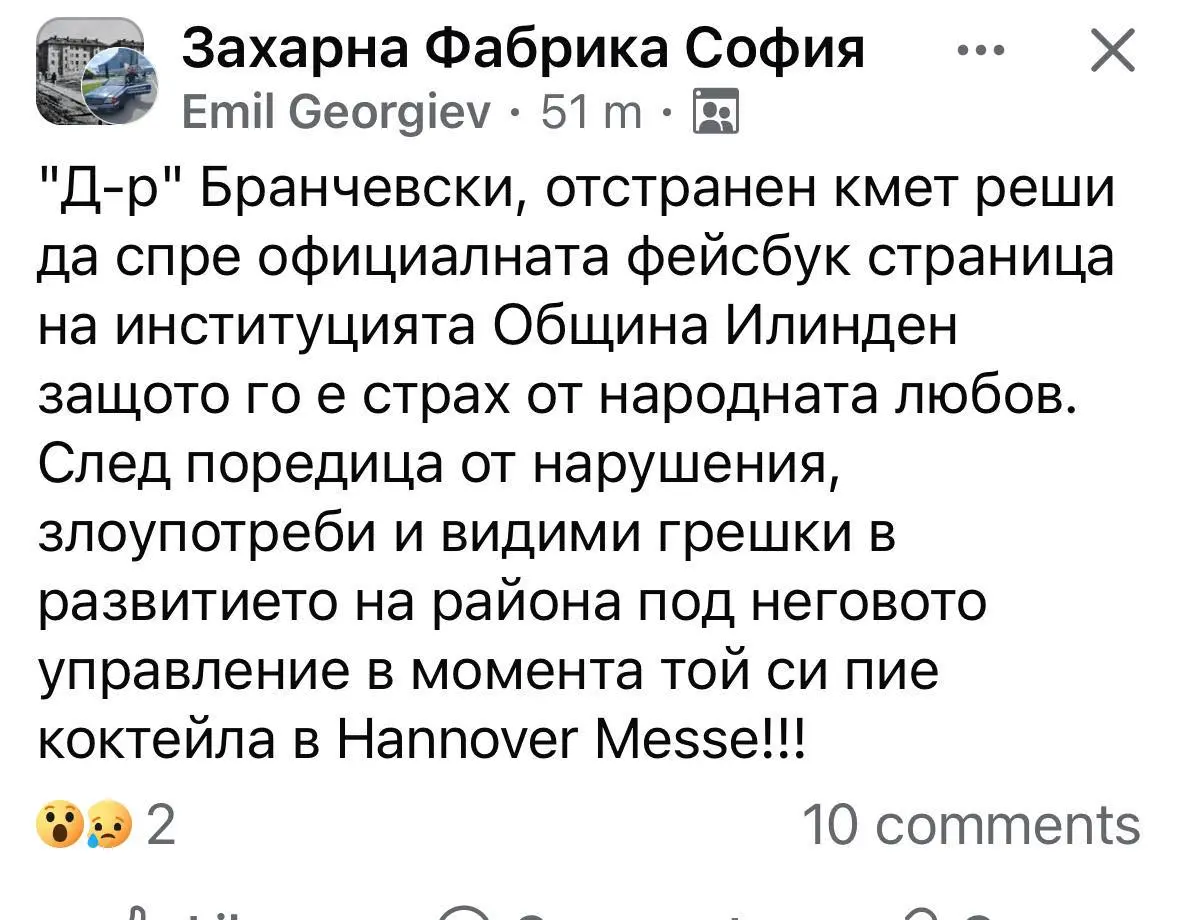 Освен че не е работното си място във Фейсбук групата на „Захарна фабрика София“ потребител се оплака, че отстраненият кмет е спрял официалната фейсбук страница на институцията Община „Илинден“. По думите на причината е „страх от народната любов“.