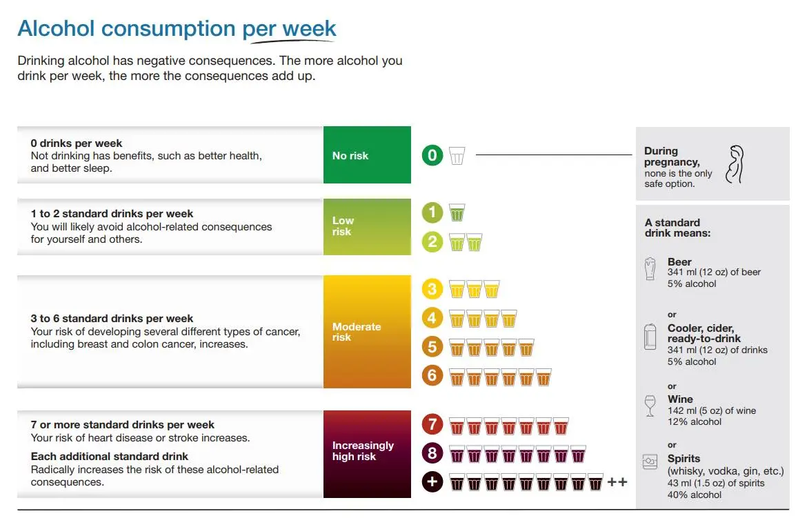 Най-лесно е да го разберете, ако разгледате канадските препоръки. Инфографиката е отдолу в коментар. Подчертавам, че под "стандартно питие" се разбира 341 мл бира (5% абсолютен алкохол), 142 мл вино (12% абсолютен алкохол) или 43 мл „твърд“ алкохол (водка, уиски, джин - 40% концентрат).