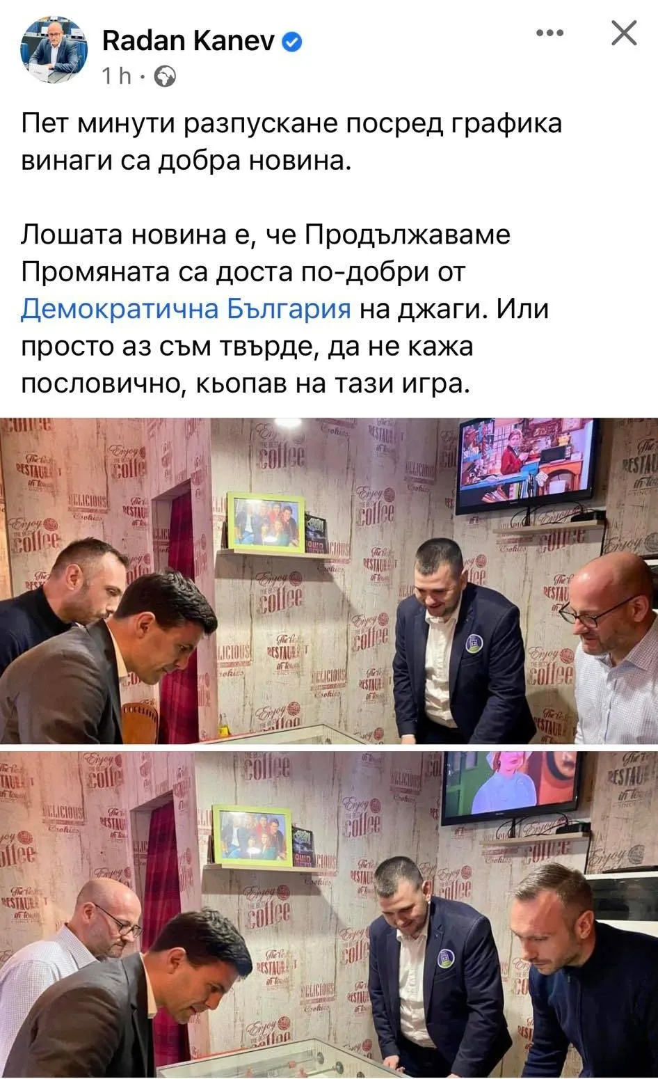 „Пет минути разпускане посред графика винаги са добра новина. Лошата новина е, че Продължаваме Промяната са доста по-добри от Демократична България на джаги. Или просто аз съм твърде, да не кажа пословично, кьопав на тази игра“, написа Радан Кънев към снимките с видимо доволния Никола Минчев.