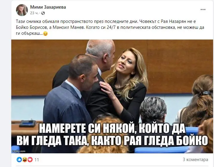 „Не можеш на объркаш, ако следиш политическата обстановка 24/7“, пише потребителят Мими Захариева, която развенчава фалшивата публична близост на снимката.