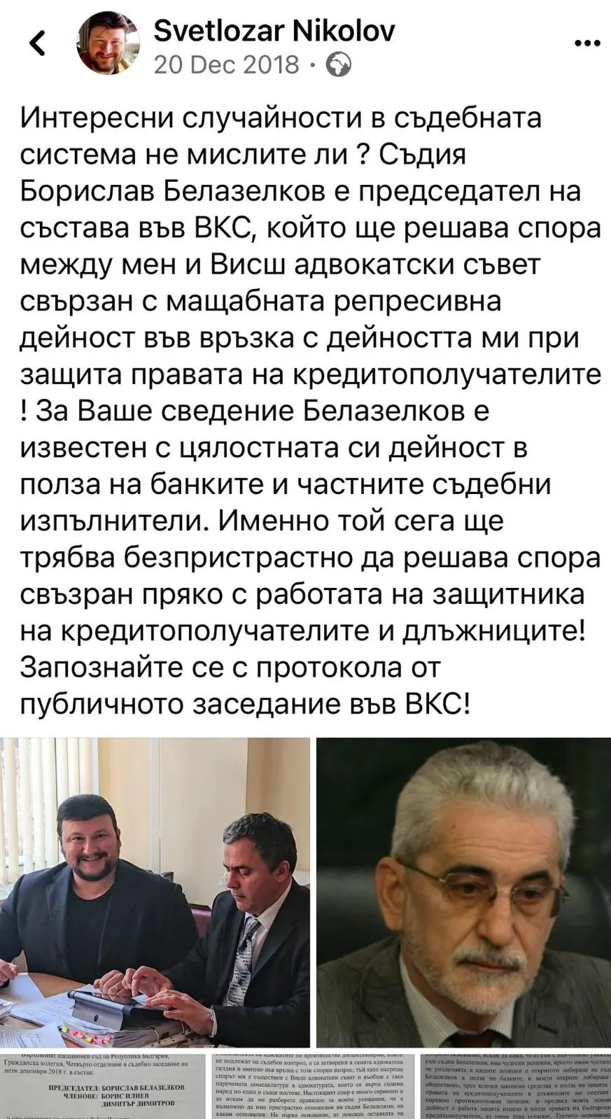 „Интересни случайности в съдебната система не мислите ли? Съдия Борислав Белазелков е председател на състава във ВКС, който ще решава спора между мен и Висш адвокатски съвет, свързан с мащабната репресивна дейност във връзка с дейността ми при защита правата на кредитополучателите! За Ваше сведение Белазелков е известен с цялостната си дейност в полза на банките и частните съдебни изпълнители. Именно той сега ще трябва безпристрастно да решава спора свъзран пряко с работата на защитника на кредитополучателите и длъжниците! Запознайте се с протокола от публичното заседание във ВКС!”, пише Светлозар Николов през 2018 г.