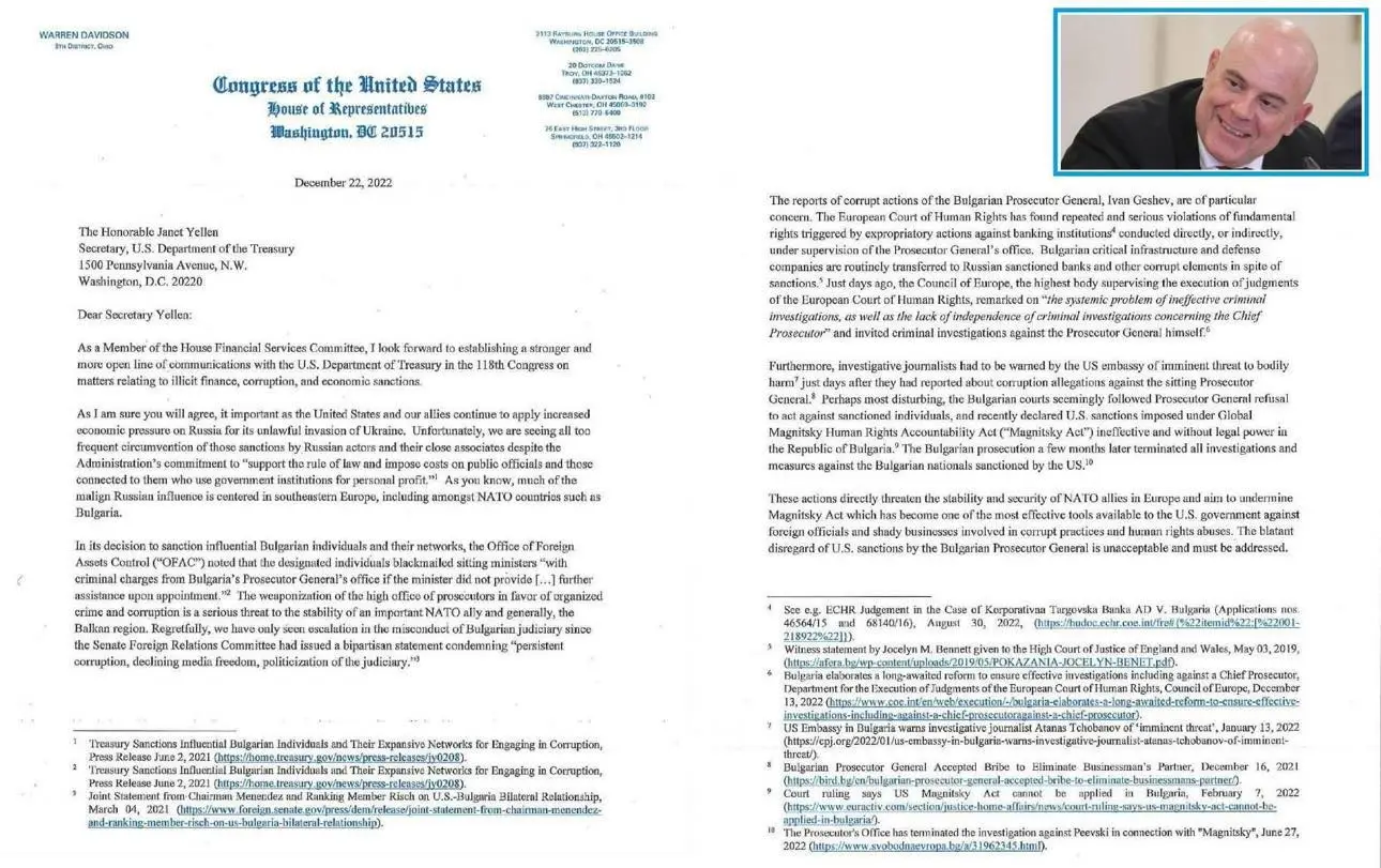 Американският сенатор Уорън Дейвидсън е написал писмо до Финансовия департамент, където посочва главният прокурор на Иван Гешев като „саботьор на санкции“ отнасящи се до закона Магнитски. Дейвидсън пък е почерпил информация за писмото си от публикации на сайтовете „Афера“ и BIRD.