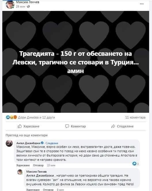 Вълна от възмущение заля страницата на режисьора Максим Генчев във Фейсбук. Поводът - негов пост, в който той обвързва обесването на Васил Левски с ужасяващото бедствие, сполетяло Турция вчера.