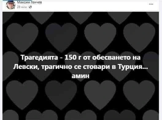 „Трагедията – 150 г. от обесването на Левски, трагично се стовари в Турция.... амин“, написа режисьорът.