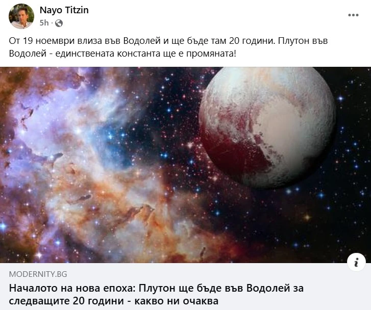 Пиарът на ПП Найо Тицин се обърна към астрологията, за да разчете какво предстои за България. Според него единственото, което предстои е „промяна“, защото Плутон влиза във Водолей.