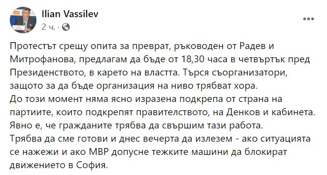 Според Василев трябвало да има контрапротест срещу земеделците, защото те били ръководени от Радев и Митрофанова. Предложението на Василев е съорганизаторите да намерят хора за този четвъртък за 18:30 часа.