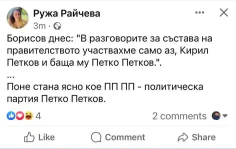 „Борисов днес: "В разговорите за състава на правителството участвахме само аз, Кирил Петков и баща му Петко Петков.“, написа Райчева.
