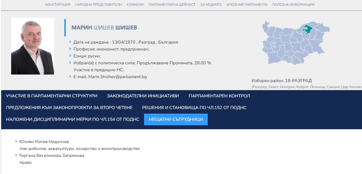 Разградският депутат от „Продължаваме промяната“ Марин Шишев е назначил сестрата на известен журналист от „Капитал“ за своя нещатна сътрудничка в парламента. Това става ясно от страницата му на сайта на Народното събрание.