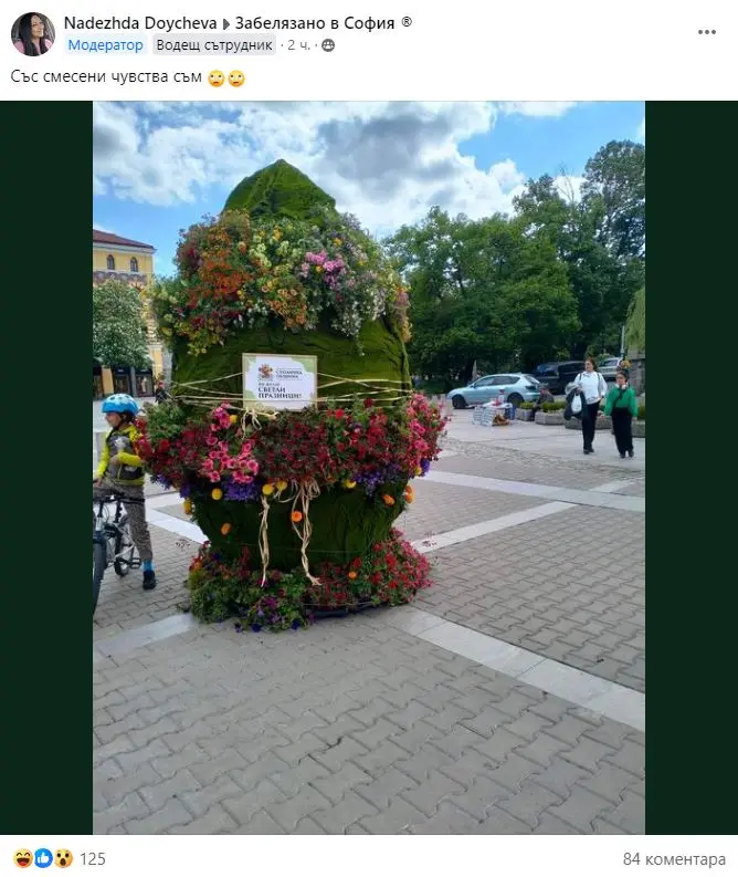 „И за Коледа, и за Великден - София прилича на едно голямо НИЩО“, „Много грозно“, „пародия“, „балатум“ и „къщичка на хобит“ – това са само един от коментарите под снимка на една от великденските украси в центъра на столицата. Голяма зелена инсталация с цветя и надпис „краси“ площад „Света Неделя“. То се състои от 3 елемента и трябва да наподобява на великденско яйце.