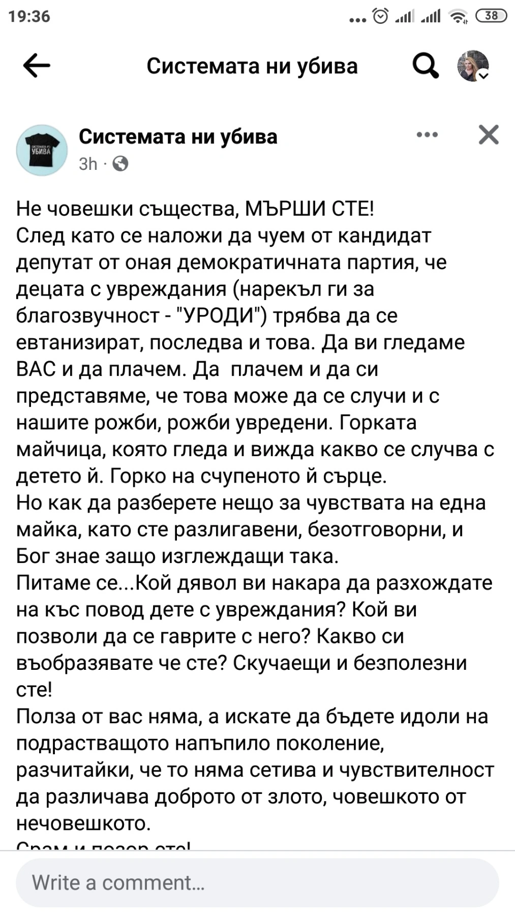След като се наложи да чуем от кандидат депутат от оная демократичната партия, че децата с увреждания (нарекъл ги за благозвучност - "УРОДИ") трябва да се евтанизират, последва и това. Да ви гледаме ВАС и да плачем. Да плачем и да си представяме, че това може да се случи и с нашите рожби, рожби увредени. Горката майчица, която гледа и вижда какво се случва с детето й. Горко на счупеното й сърце.