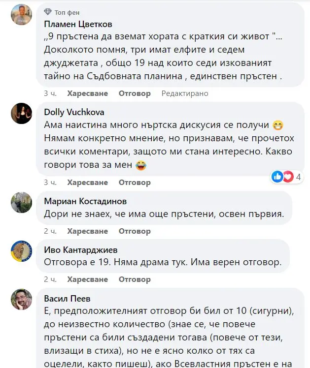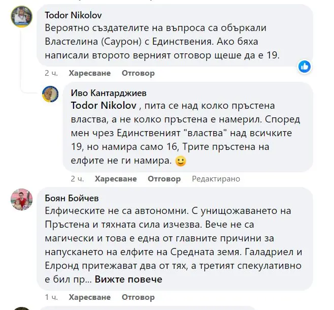 Като нърд на тема Властелина няма как да не възроптая, че нито един от отговорите не е верен. "Три пръстена за елфите крале под този небосклон и седем за джуджетата в дворци от камък, да вземат девет хората, обречени на смърт и един за мрачният господар на мрачния му трон..." 3+7+9+1=20, до толкова и аз мога да смятам. Друг е въпросът че част от джуджешките пръстени са унищожени, а трите на елфите са автономни до голяма степен, та въпросът става историко-философски.