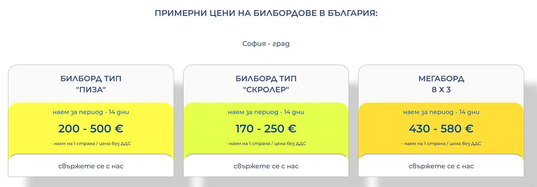 Прилагам актуални примерни цени за наем на билборд за две седмици в София.