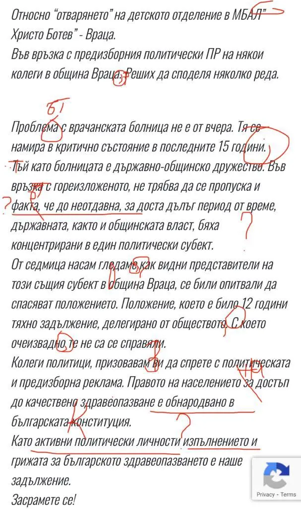 От несвързаните послания разбираме единствено, че някой трябва да се засрами и че този някой не е настоящият министър на здравеопазването Хинков, който само три пъти и то за кратко време успя да излъже жителите на областта, че МЗ ще се справи с проблемите в МБАЛ „Христо Ботев“-Враца, а после обвини общините, пише zovnews.