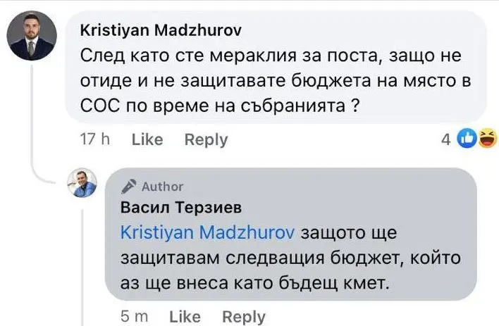Запитан от Кристиян Маджуров защо не отиде лично да защитава на място бюджета в СОС по време на събиранията, Терзиев отговаря: Защото ще защитавам следващия бюджет, който аз ще внеса като бъдещ кмет“.