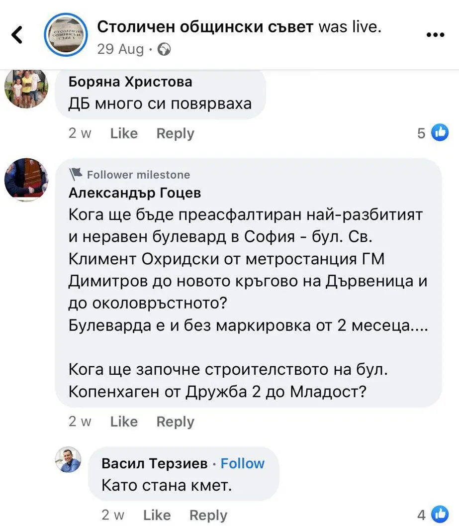 По всичко личи, че наследникът на ДС фамилия е убеден в своята победа и вече се изявява като градоначалник на столицата. „Кога, господин кандидат? Като стана кмет“, пък е новата шега в мрежата към Терзиев.