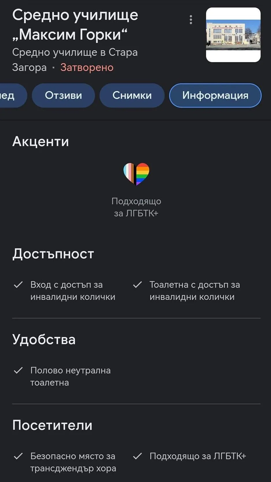 Училището в Стара Загора „Максим Горки“ се обяви за подходящо за ЛГБТИ. Според учебното заведение се въвеждат полово неутрални тоалети, за да може всички деца да са еднакви, независимо от това дали са момчета или момичета.