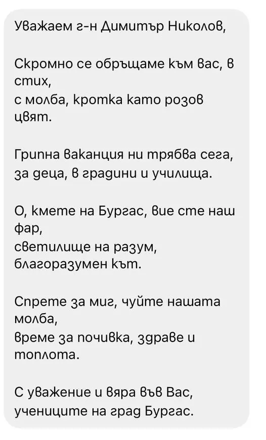В стихове ученици от Бургас молят кмета Димитър Николов за грипна ваканция