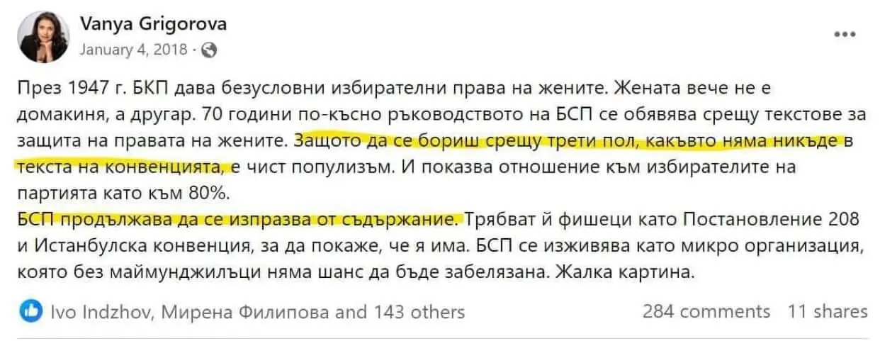 Тези определения Грирогова пише пред 2018 година по повод на Истанбулската конвенция и водената война на БСП към третия пол. По думите на кандидат-кметицата на БСП подобно понятие не съществува в конвенцията, а всичко което БСП срещу въпросната Истанбулска конвенция е нищо повече от „чист популизъм.“