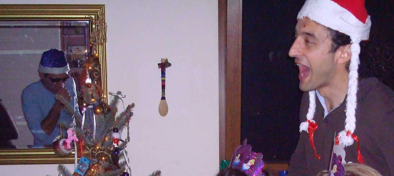 Ето ги тука двамата родни герои в една любима стара снимка от детско коледно парти, на което Кирил си забърсва напудрения нос и е със слънчеви очила вечерно време у дома.