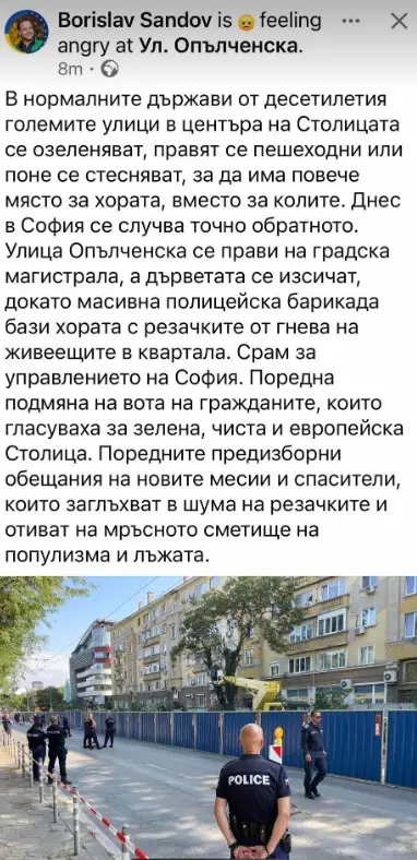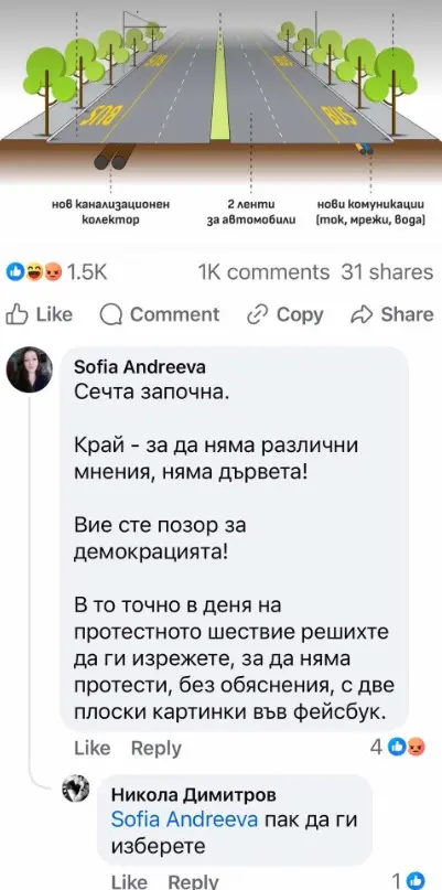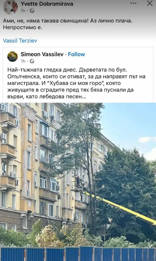 Точно в момента детето на ДС и кмет на София Васил Терзиев, заедно с розовите си другари от ПП, СС и ДБ убиват десетки дървета на красивата столична улица "Опълченска", въпреки всички протести срещу тази гавра със зелените обещания, с които ни заливаха преди изборите настоящите гамени, начело на СО.