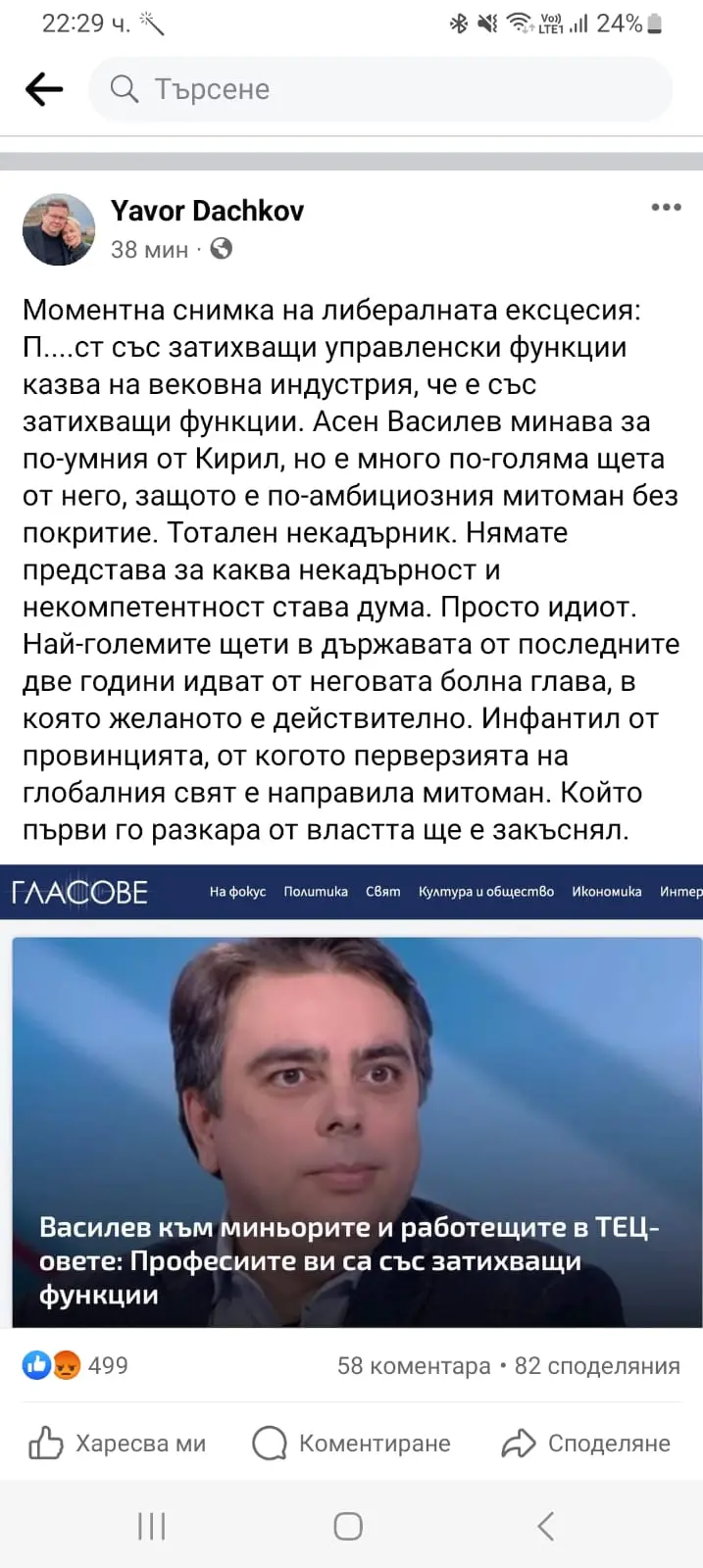 Моментна снимка на либералната ексцесия: П...ст със затихващи управленски функции казва на вековна индустрия, че е със затихващи функции. Асен Василев минава за по-умния от Кирил, но е много по-голяма щета от него, защото е по-амбициония митоман без покритие. Тотален некадърник. Нямате представа за каква некадърност и некомпетентност става дума. Просто идиот. Най – големите щети в държавата последните две години идват от неговата болна глава, в която желаното е действително. Инфантил от провинцията, от когото перверзията на глобалния свят е направила митоман. Който първи го разкара от властта ще е закъснял.