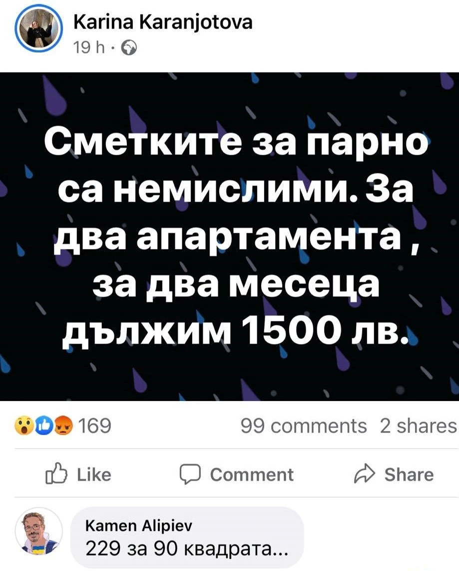 За непосилни сметки за парно сигнализираха журналисти във Фейсбук. По думите им за два месеца сумата, която трябва да изплатят на „Топлофикация” е 1500лв. Припомняме, че цената на парното тръгна драстично нагоре още в средата на миналата година. Тарифите бяха увеличени с близо 40%, а като основна причина се изтъкна цената на природния газ, който ползват топлофикациите.