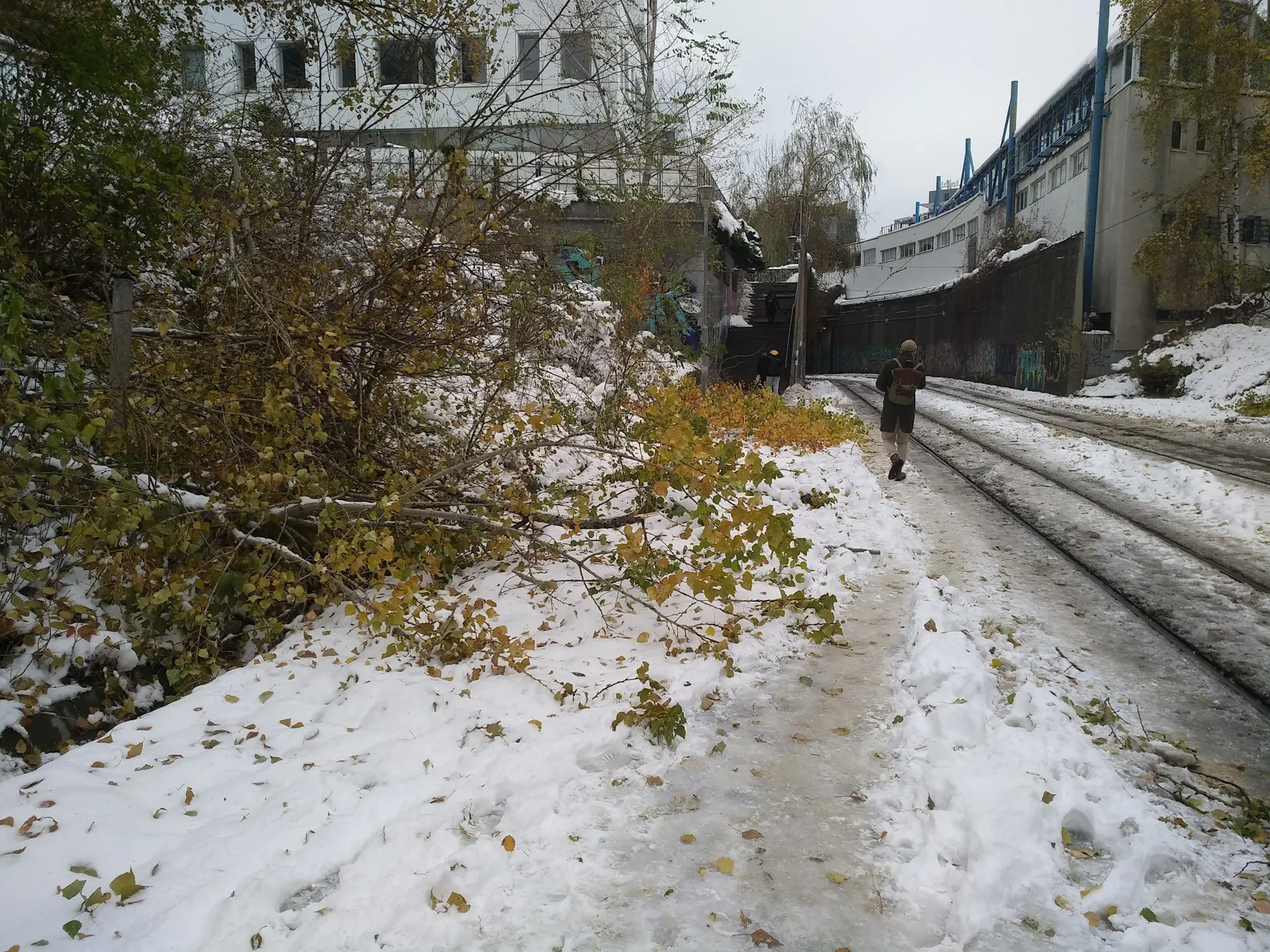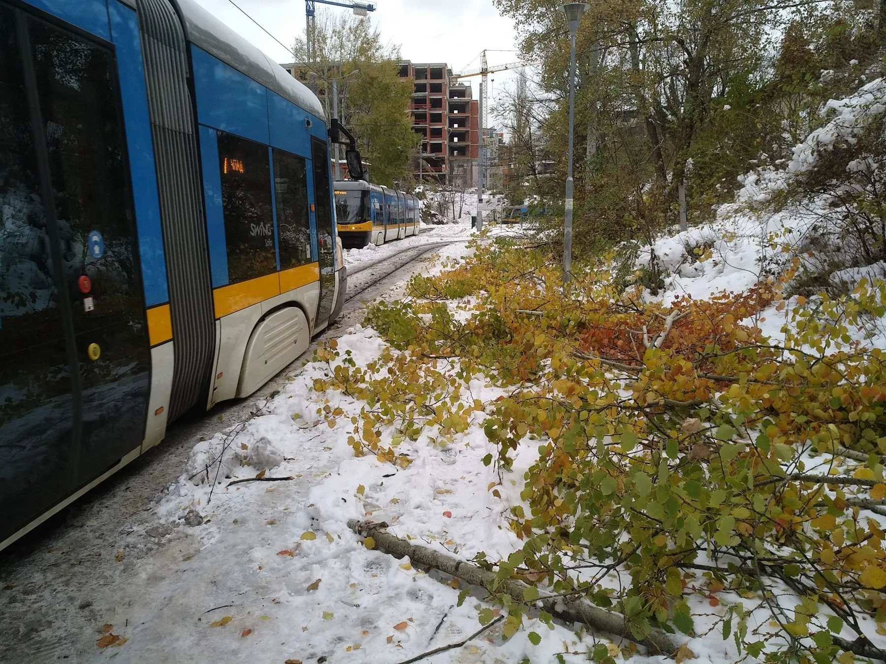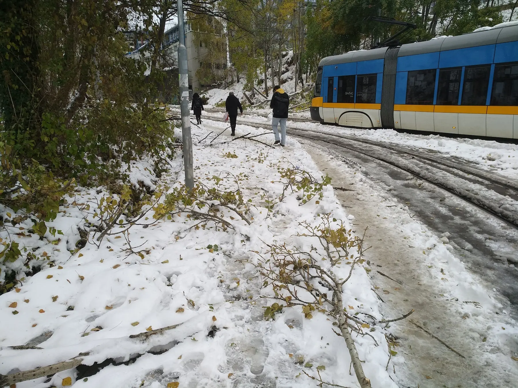 Блокиран тротоар, заринат от вече заледен непочистен сняг, изпочупени клони и хора, ходещи по трамвайните релси.