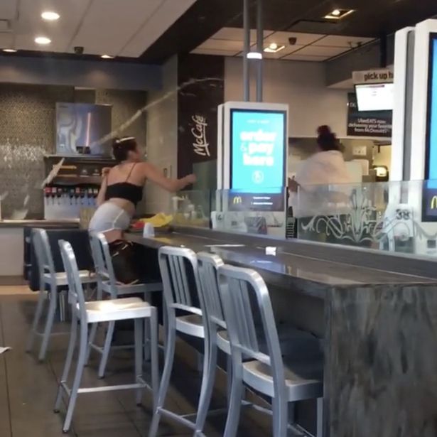 Клиентката също може да бъде чута, казвайки: "Ето защо вашият задник е зад шибания тезгях", преди да почне да хвърля пържени картофи през ресторанта.