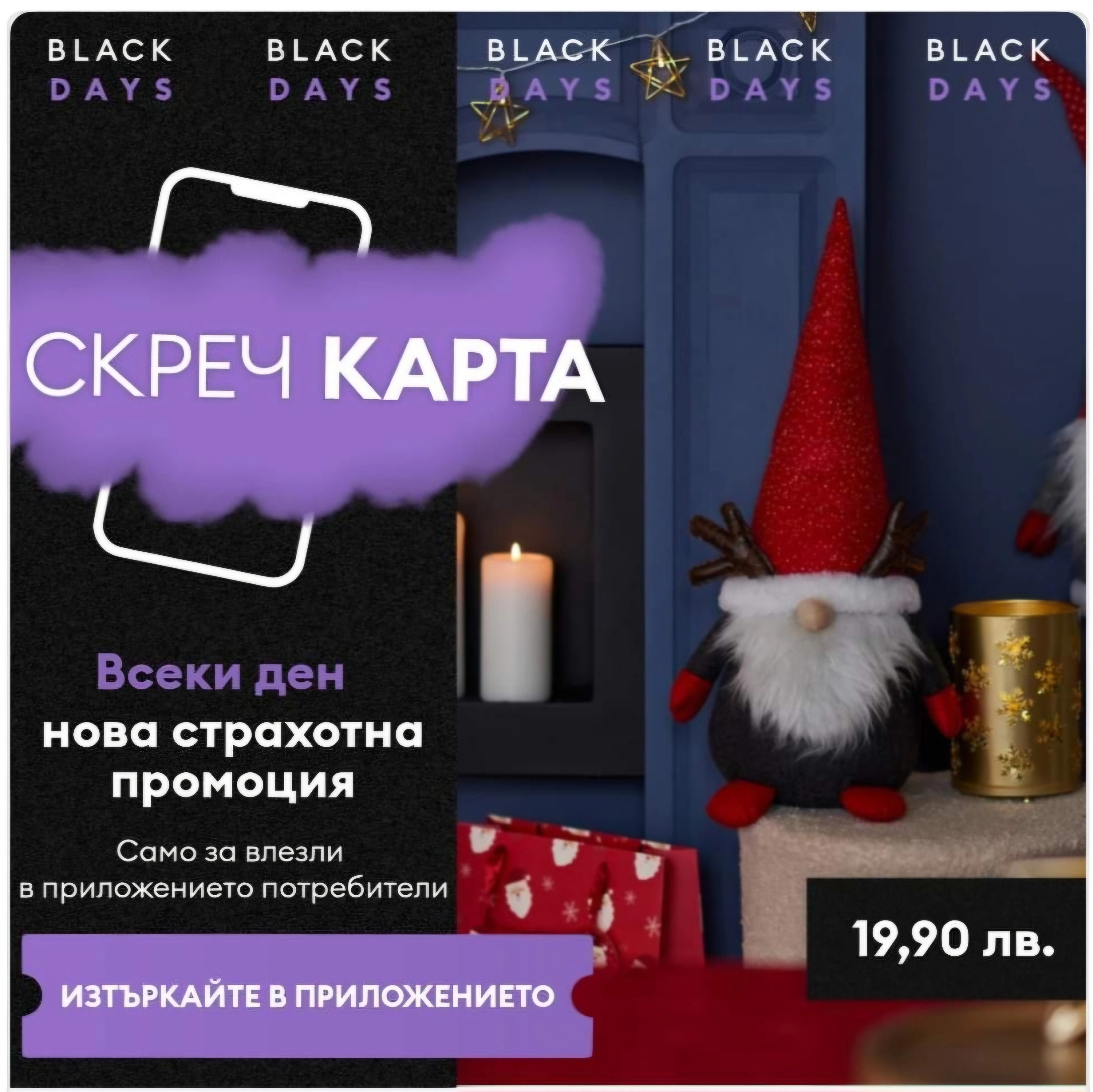 Вниманието на потенциалните клиенти се привлича с т. нар. карусел реклама във Facebook, която съдържа поредица от визуализации със снимки на коледно-новогодишни стоки и отличителен стикер „супер промоция Black days“. В текста към поста се посочва, че офертата важи „само за потребители, влезли в приложението“. Така хората остават с впечатлението, че ако си изтеглят апликацията и се регистрират, ще могат получат достъп до промотираната „скреч карта“ за отстъпки и да си закупят по-изгодно някои от представените коледни сувенири.