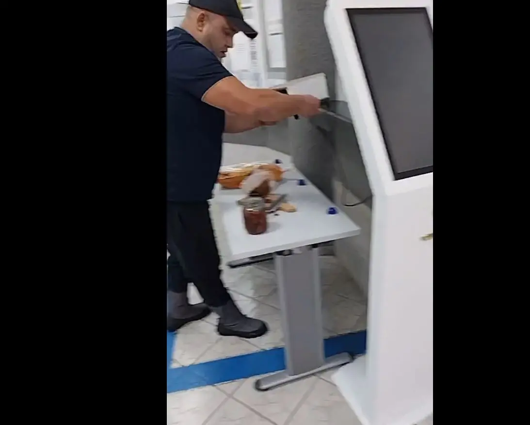Охраната на електроразпределителното дружество опитва да го спре, но мъжът е твърдо убеден, че няма да напусне, докато не си направи закуска. „Когато не го платя, го спирате. Искам да си направя сандвичи. 24 часа не съм ял. И децата ми стоят гладни вкъщи. Звъня и не ми вдигате. Не ме интересува. В 21 век – 24 часа без ток“, крещи мъжът и настоява да му се донесат разклонител, за да си включи скаричката.
