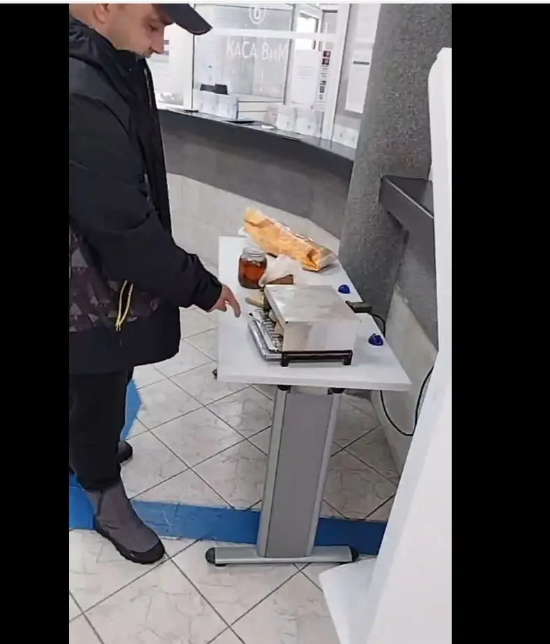 След като не получава такъв, той изключва машината за теглене за билети за ред и я включва там. Мъжът дори кани кмета на селото да закусват заедно като си отваря компот и се заканва, че ще стои в енергото.