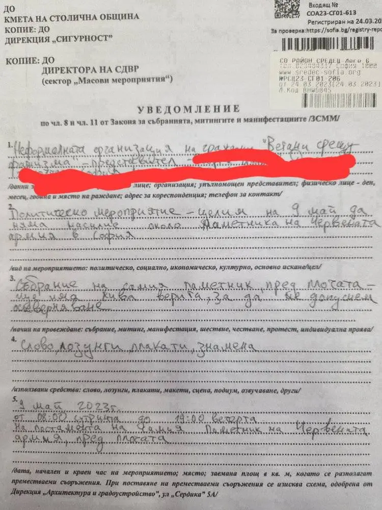 Той публикува заявка за събитие на организацията „Вегани срещу фашизма“, които искат разрешение за мероприятие пред Паметника на съветската армия на 9 май.