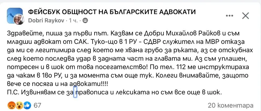 Столичният адвокат Добри Райков се оплака, че е бил ударен от работещ в Първо Районно в София. В групата във Фейсбук на българските адвокати мъжът разказва, че е младши адвокат и отива около 19:00 часа отишъл в районното като защитник на 19-годишен, който е задържан.