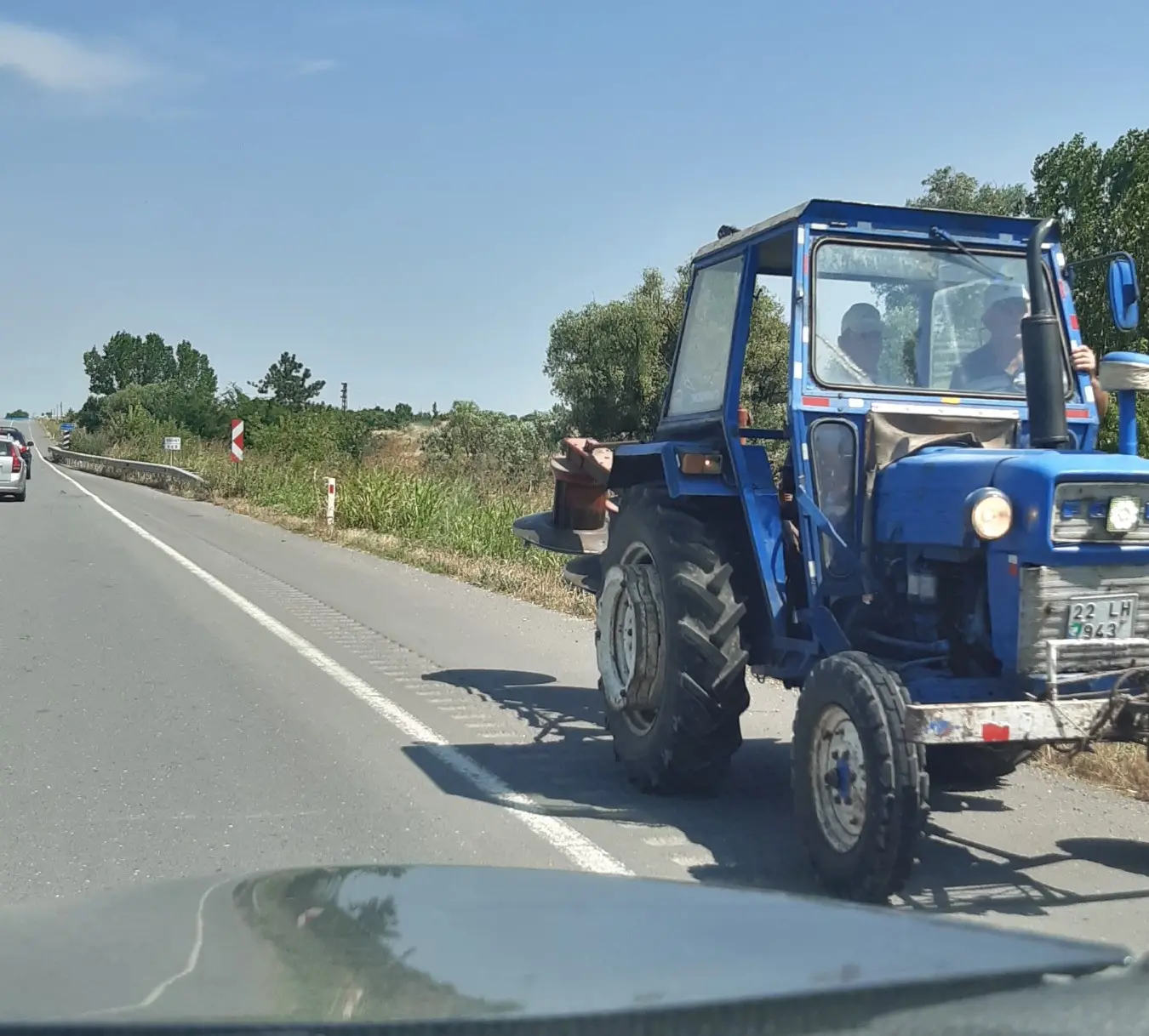 Това да срещнеш трактор в насрещното движение си е нещо нормално. Чат-пат и някой моторист. А каска на моторист е екстравагантна прищявка. Официалната им състезателна униформа са джапанки.