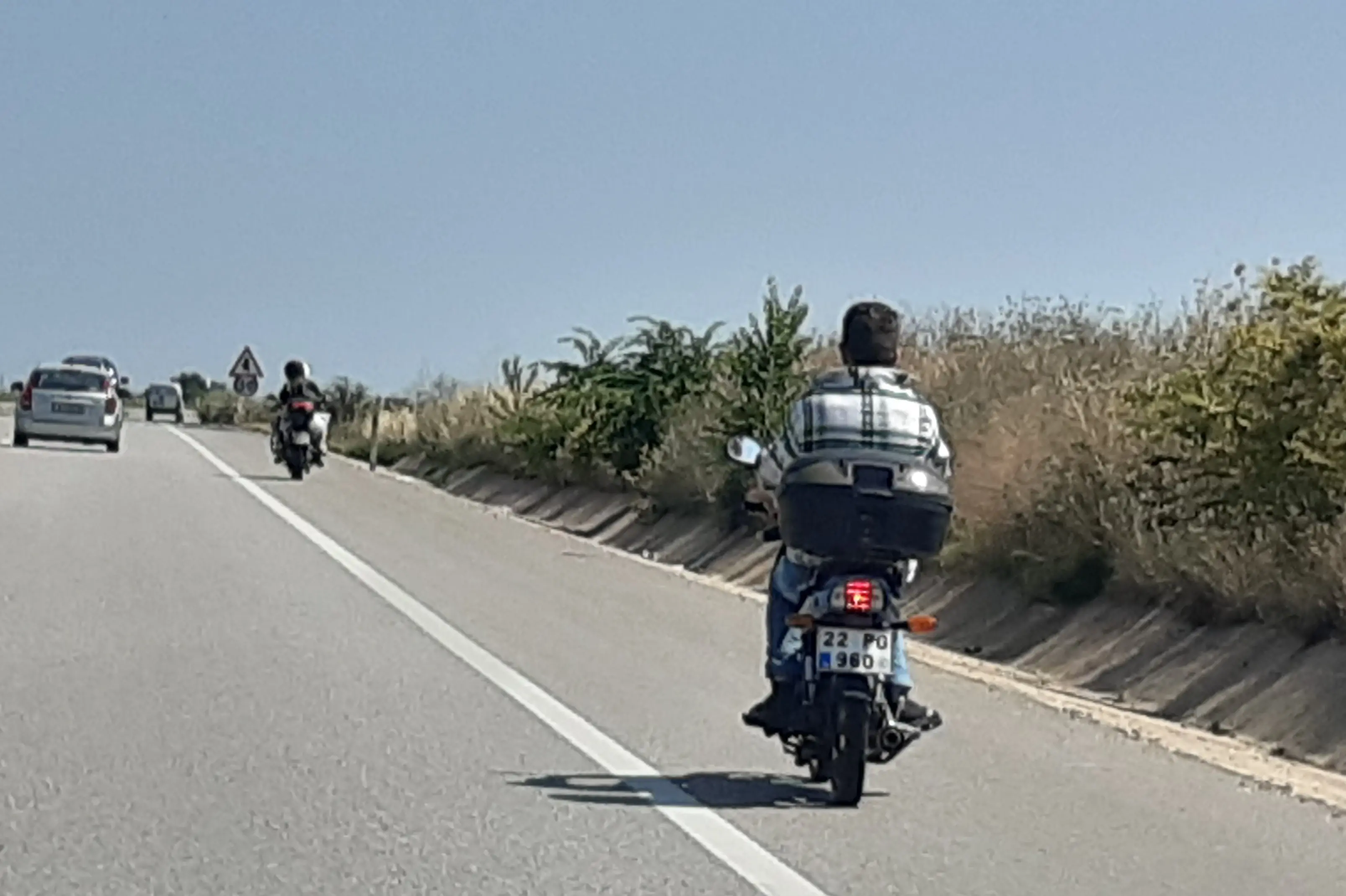Официалната униформа на мотористите в Турция изключва каска, но включва джапанкиИзбираме си маршрут основно по магистрали, за да избегнем влизането в Измир в час-пик. Пътуващите от България обикновено карат нощем, но ние сме в най-натовареното време. И изведнъж – тапа. 2 часа караме броня в броня, защото разделят ли ни нахалните турци, после не можем да се намерим чак до хотела, който е на около 700 км.