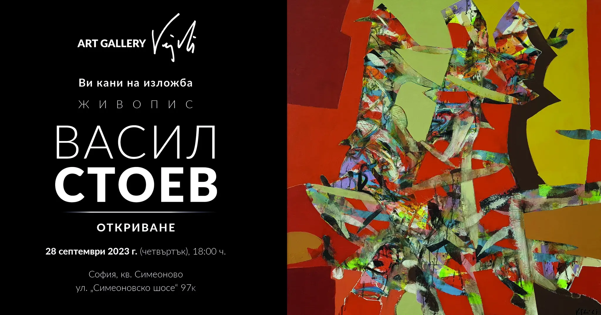 Арт Галерия Vejdi представя изложба живопис на Васил Стоев. Известният наш творец показва във вип арт пространството на „Симеоновско шосе“ 97 к специално подбрани творби. Изложбата ще бъде открита на 28 септември 2023г. – четвъртък, в 18 часа.