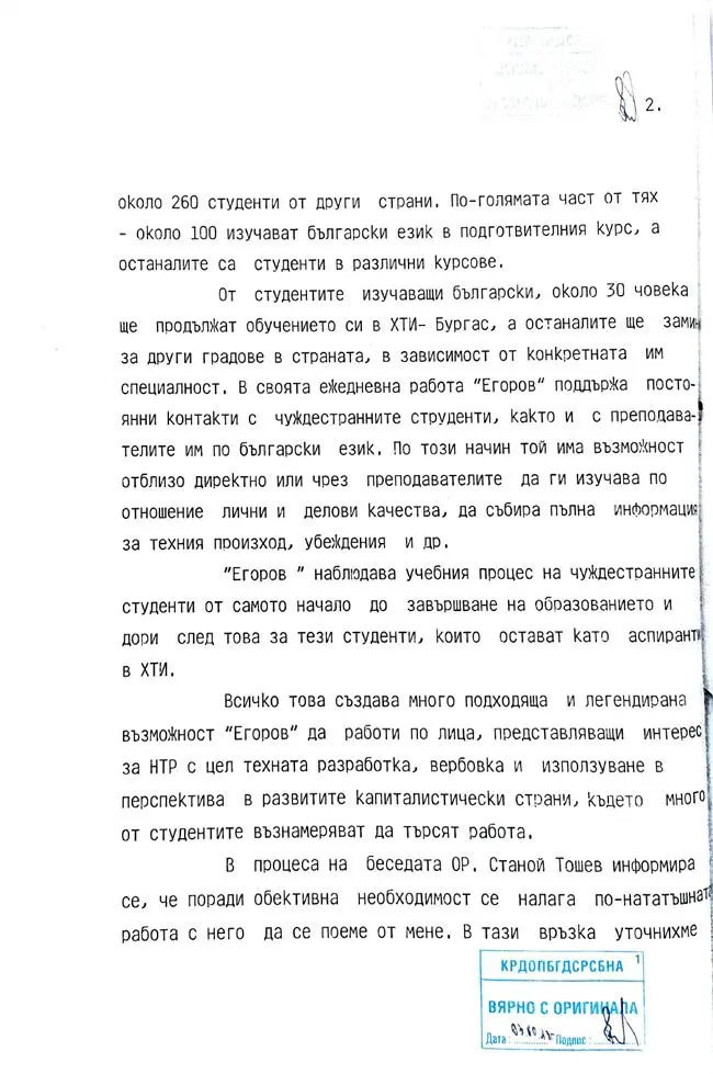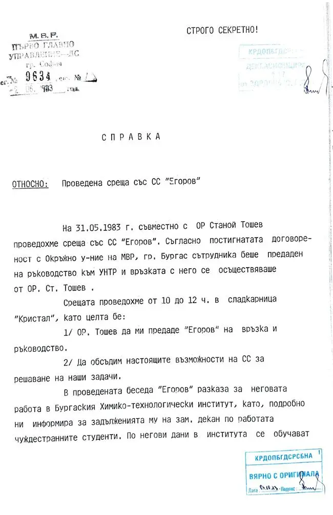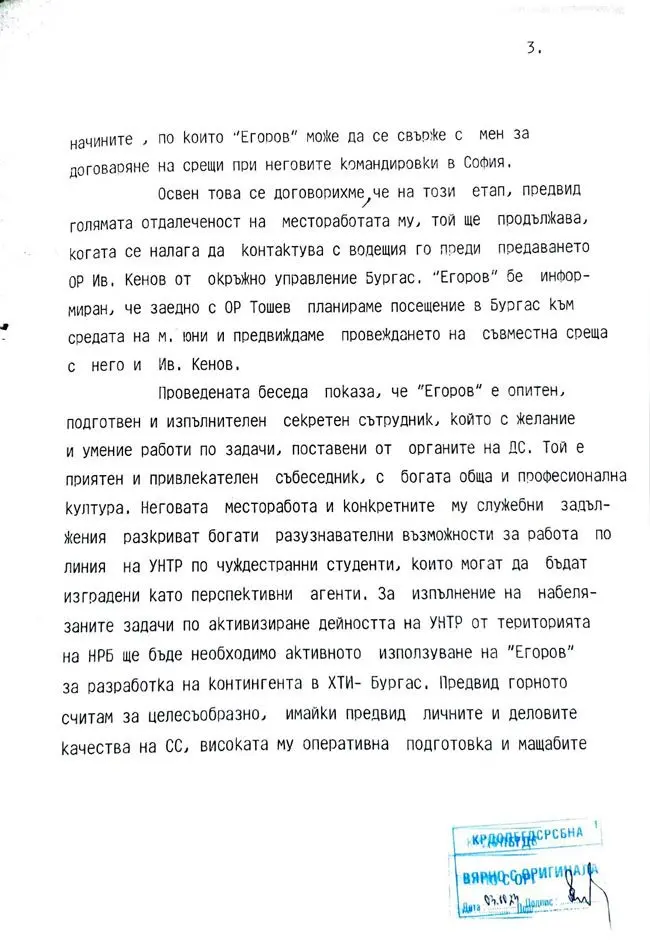 „В проведената беседа „ЕГОРОВ“ разказа за неговата работа в Бургаския Химико-технологически институт, като подробно ме информира за задълженията му на зам.-декан по работата с чуждестранните студенти. По негови данни в института се обучават около 260 студенти от други страни… В своята ежедневна работа „ЕГОРОВ“ поддържа постоянни контакти с чуждестранните студени, както и с преподавателите им по български език. По този начин той има възможност отблизо директно или чрез преподавателите да ги изучава по отношение на лични и делови качества, да събира пълна информация за техния произход, убеждения и пр.“