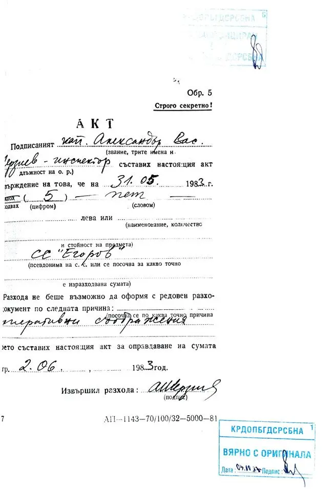 Строго секретен акт за изразходвани средства по „оперативни съображения“ от първата си среща със секретния сътрудник „ЕГОРОВ“, оформен и подписан от водещия му офицер Александър Терзиев | Източник: Comdos.