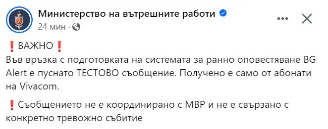 Малко по-късно от МВР публикуваха съобщение, че предупреждението не е координирано с МВР и не е свързано с конкретно тревожно събитие.
