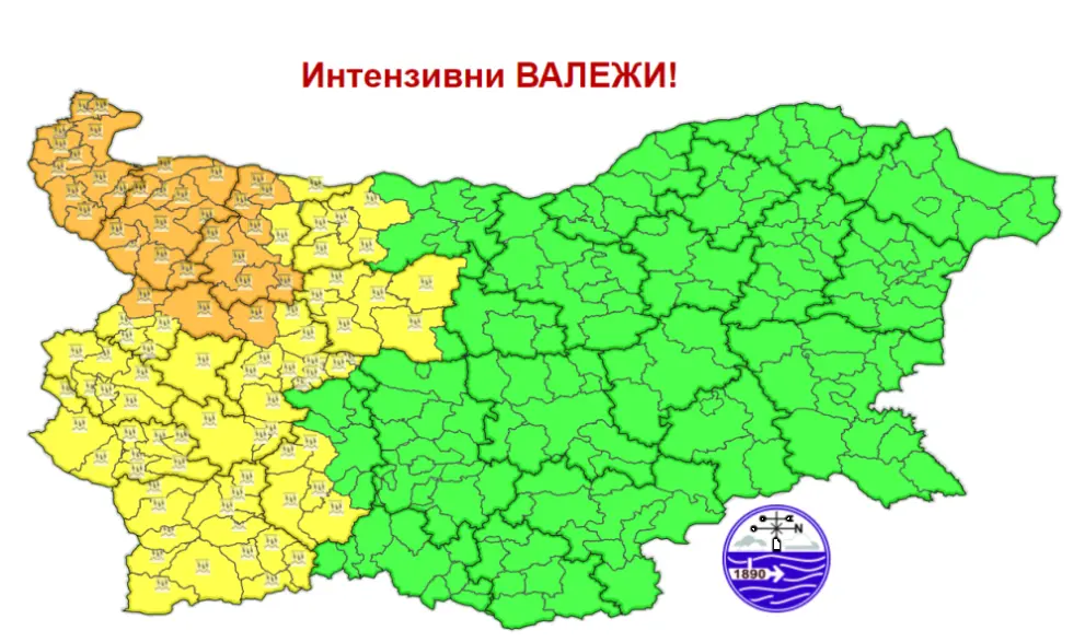 Максималните температури в страната ще са от 27-28 градуса в западните райони до 33-34 в югоизточните, в София - около 28. Обявен е оранжев код за 4 области в Северозападна България за интензивни валежи и бури, това са областите Видинска, Монтанска, Врачанска и София област, жълт код е обявен за 7 области в Северна и Западна България също за интензивни валежи и опасност от градушки. Това са областите Плевенска, Ловешка, София град, Пернишка, Кюстендилска, Пазарджишка и Благоевградска.