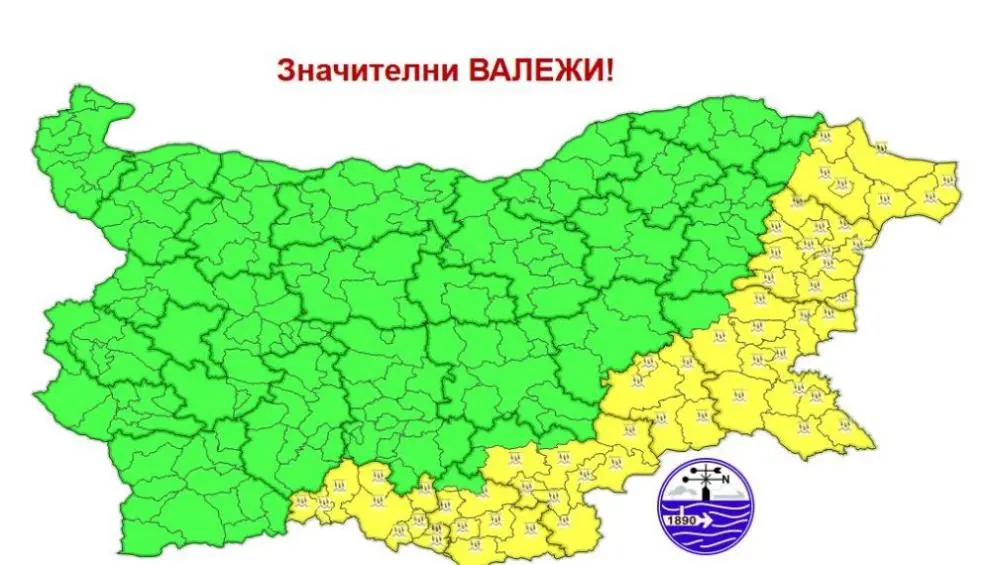 Жълт код за обилни валежи е обявен за областите Смолян, Кърджали, Хасково, Ямбол, Бургас, Варна и Добрич.