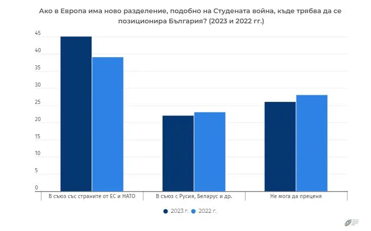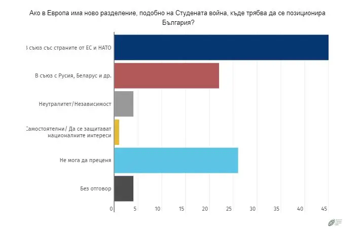 Близо 45% от анкетираните заявяват, че България трябва да се позиционира в съюз със страните от НАТО и ЕС в случай на ново разделение в Европа подобно на това от времето на Студената война. За съюз със страни като Русия и Беларус се обявяват 22% от запитаните. Близо 4% биха предпочели неутралитет/независимост, а 1% за са самостоятелност/да се защитават националните интереси. Хората, които не могат да преценят или не отговарят на въпроса, са близо 30%.