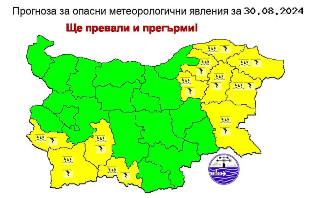 За областите Кюстендил, Благоевград, Пазарджик, Смолян, Силистра, Разград, Търговище, Шумен, Варна, Добрич и Бургас е обявен жълт код за потенциално опасно време. Очакваните количества дъжд са 25-30 mm.