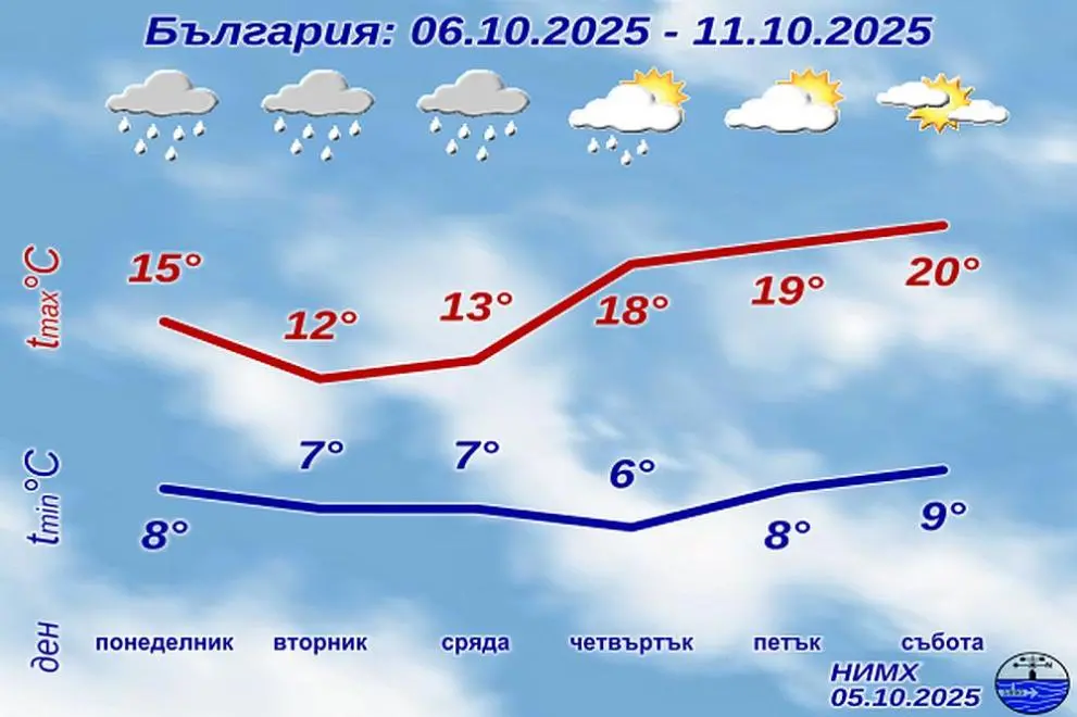 Ще духа умерен вятър от запад-северозапад, в Източна България - от североизток. Преобладаващите максимални температури ще бъдат между 10° и 15°, а минималните - между 6° и 11°. В София минималната температура ще е около 7°, а максималната - около 10°.
