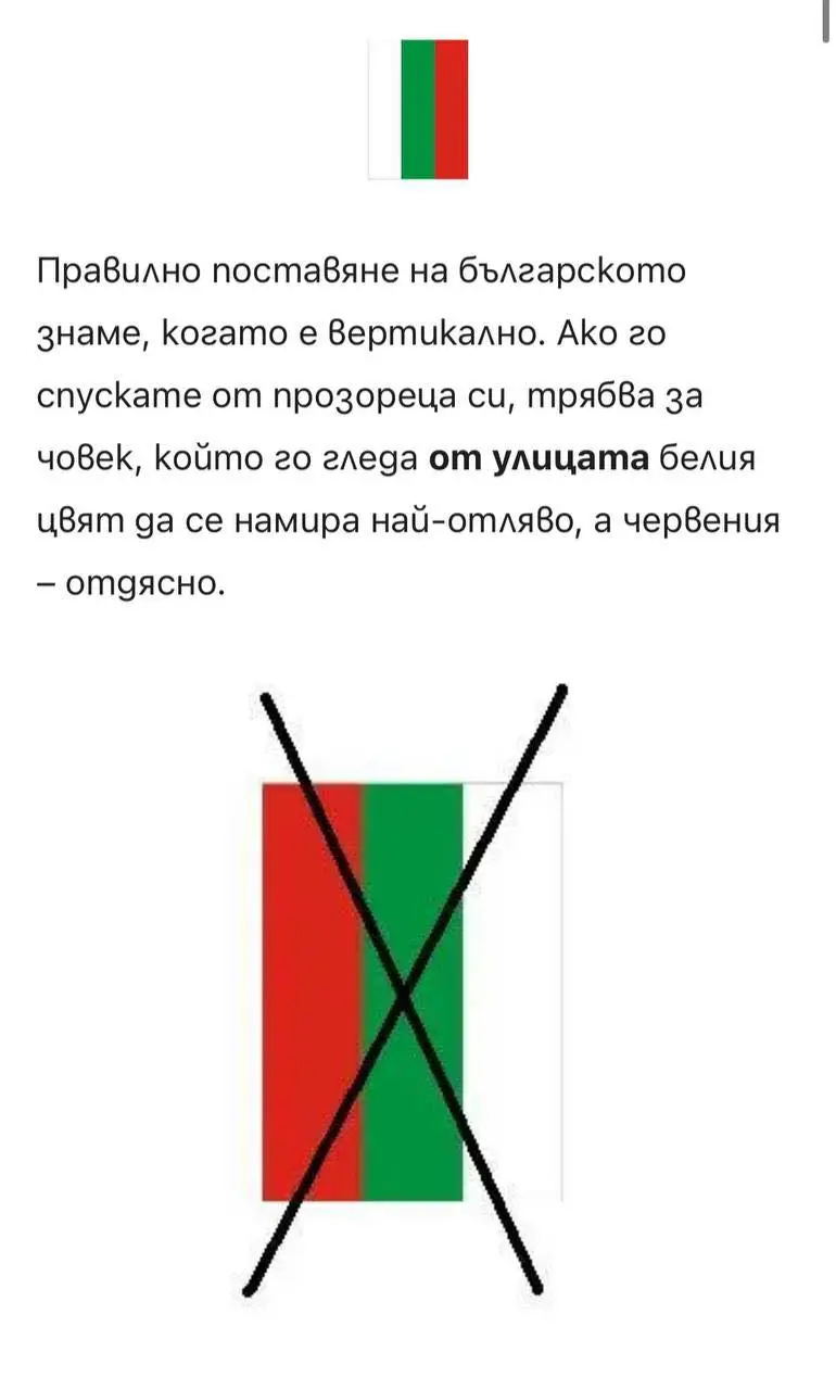 Правилното поставяне на българското знаме, когато е вертикално е белия цвят да се намира най-отляво, а червеният – отдясно.