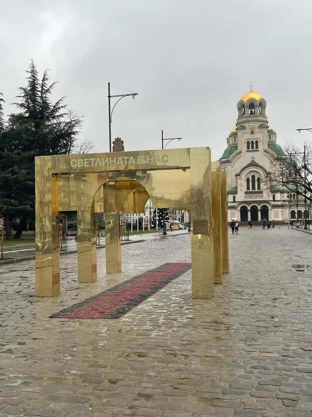 Изчезна "почетният" червен килим под златната арка пред храм-паметника в София
